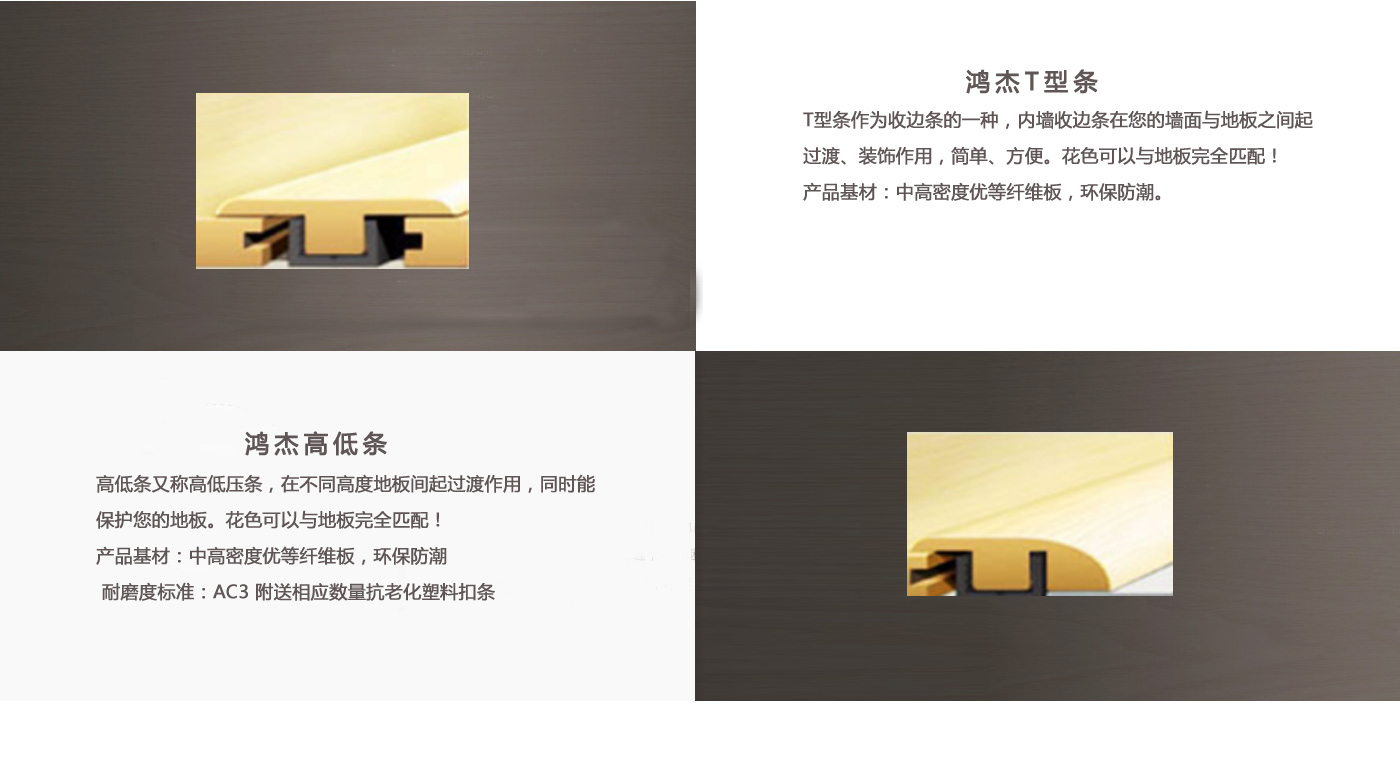 專(zhuān)業(yè)生產(chǎn)各類(lèi)地板輔料。本廠成立于2008年,經(jīng)過(guò)嚴(yán)格的質(zhì)量控制,已開(kāi)發(fā)出SPC、WPC、層壓板三種不同的壓花材料。每一種材料都有超過(guò)7種不同的過(guò)渡型材,如t型線(xiàn)、減速器、端蓋、四分之一圓、樓梯前鼻、樓梯板、踢腳板等。